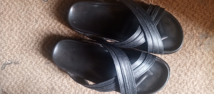 - "The image displays a pair of black sandals positioned on a light brown, textured floor surface, consistent with a carpet or rough-textured indoor flooring, within the city of Tunga Mekidi, Nigeria" by FM-GoHAg2, licensed under CC BY 4.0
