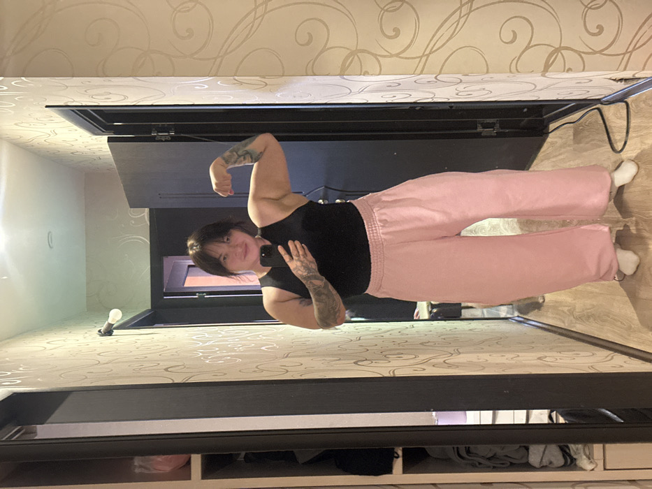 The image displays a full-length mirror reflection of a female individual in an indoor residential setting, located in Chaikovsky, Russia. The individual, appearing to be an adult, stands facing the mirror while holding a black smartphone in her left hand, ostensibly capturing a selfie. She is flexing her right bicep, and visible tattoos are present on both arms. Her hair is dark, shoulder-length, and includes bangs. She is wearing a black tank top, light pink wide-leg sweatpants with an elastic waistband, and white socks. The environment reflected in the mirror includes light-colored walls adorned with a subtle, swirling patterned wallpaper and a light-toned wooden or laminate floor. A bare light bulb fixture is mounted on the wall to the left of the frame. In the background, two dark-colored doorways are visible, one of which is slightly ajar, revealing a darker interior space. To the far left, a light-colored open shelving unit or wardrobe containing folded items is partially observed. A black electrical cable lies on the floor near the right doorway.