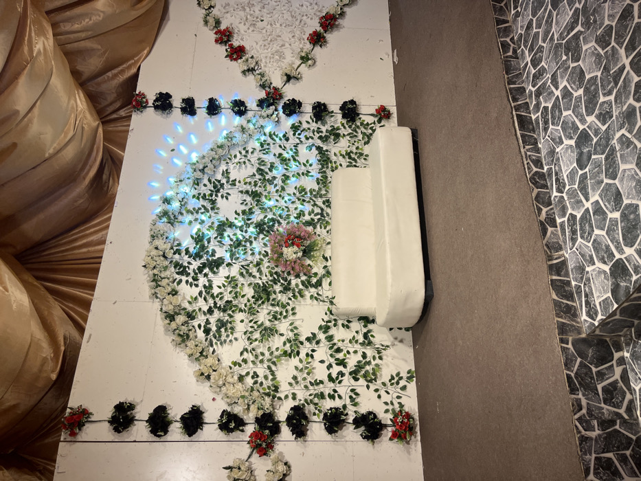 A decorated white platform features floral arrangements. A heart shape is composed of white and red flowers at the top. A larger, more intricate design of green foliage and white flowers surrounds a pink and white floral centerpiece. A string of black and red floral decorations runs along the edge. A white cushioned structure sits to the right. The background includes beige drapery on the left and a stone-patterned wall on the right. The flooring is brown.