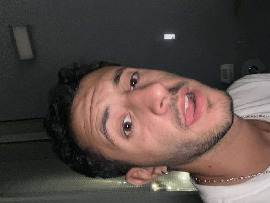 A medium close-up, dimly lit image depicts an adult male subject, appearing to be in his 20s or 30s, looking directly at the camera. He has dark, curly hair, brown eyes, and stubble on his face. His tongue is slightly extended from his mouth. A small scar is visible on his left cheek (viewer's right). He wears small hoop earrings in both ears and a silver-colored chain necklace over a white t-shirt. The background is dark; to the left, blurred lights are visible through what appears to be a window, suggesting an urban night setting. To the right, a dark wall displays a rectangular light fixture near the top and a faint, small white rectangular object below it. The scene is an indeterminate urban interior, city of Unknown, Unknown, at night.