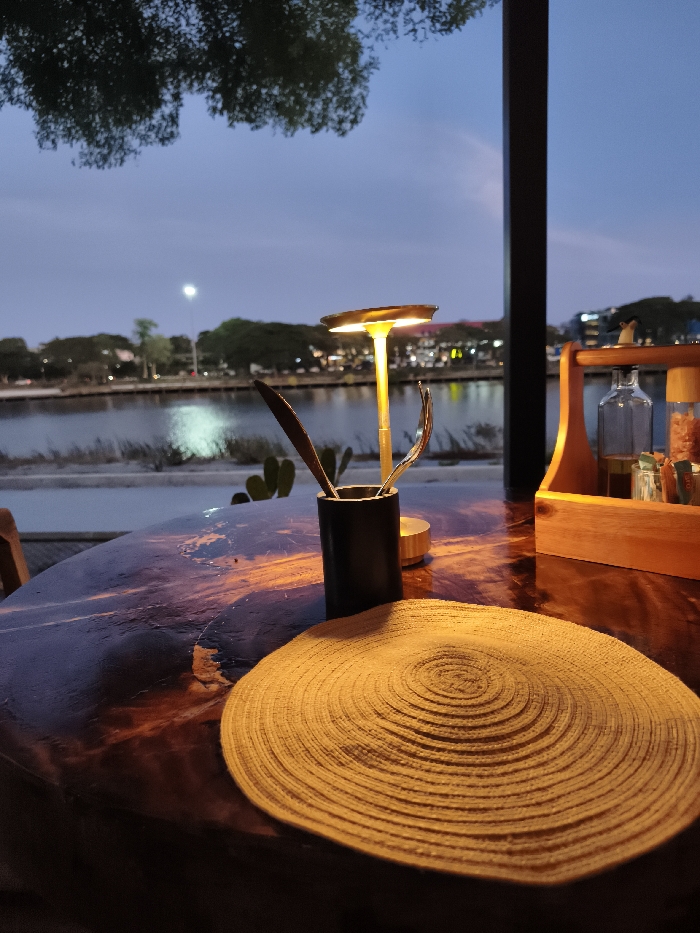 The image depicts a dining setup at dusk in Baan Chaweng, Thailand, overlooking a body of water, likely Chaweng Lake. In the foreground, a dark, glossy, irregularly shaped wooden table features a light brown circular woven placemat with concentric rings. Centrally located on the table is a black cylindrical holder containing a dark-handled knife and a silver fork. Adjacent to this, a small, illuminated golden table lamp with a flat disc top casts a warm glow. To the right, a wooden caddy holds various condiments, including a clear glass bottle and a spice shaker, topped with a small, light-colored figurine. Beyond the table, a calm body of water extends horizontally, reflecting a bright light source on its surface towards the left. The distant shore reveals blurred lights from buildings and trees under a deep blue twilight sky. A prominent, bright circular light, likely a streetlamp, is visible in the upper left background above the water. Dark tree foliage partially frames the top of the image. A dark vertical structural element, possibly a pillar, is present on the right side of the frame, separating the interior view from the exterior. No individuals are visible in the scene.