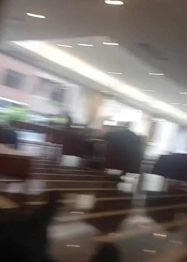 The video is taken from a seated position, showing a lobby area. There are people seated in chairs, some standing near a sign that reads "BIENVENIDOS" and a logo of "MORONI." The floor is shiny and patterned. There's a staircase visible in the background. The camera seems to be moving slightly, creating a blurry effect.