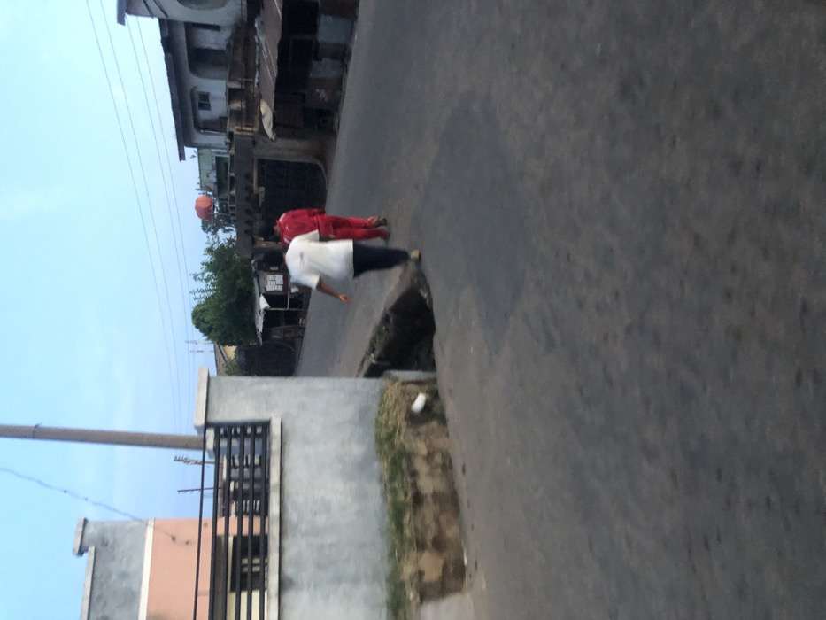 A street scene shows two people walking along a paved road. One individual is wearing a white top and dark pants while the other is dressed in a red tracksuit. A building is visible behind them with a water tower on top. A house with a gray fence sits beside the road with a utility pole in front of it. The road fills much of the frame with a slight curve. The sky appears overcast or dusky.