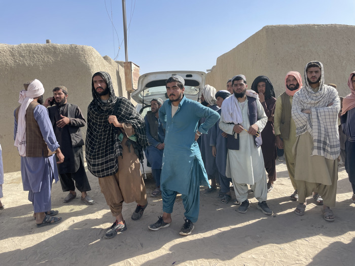 The image presents an outdoor scene in Spin Boldak, Afghanistan, under a clear, bright blue sky with strong sunlight casting distinct shadows on the unpaved, dusty ground. The background consists of several earthen-toned, adobe-style walls, likely belonging to buildings, along with a utility pole and overhead wires. A group of approximately 12-15 adult males is visible, predominantly standing in the mid-ground. Most are dressed in traditional Afghan attire, including shalwar kameez, with some wearing vests, turbans, or scarves draped over their heads or shoulders. Key individuals and objects from left to right include: * A man wearing a white turban, blue shalwar kameez, and a brown vest, with his back partially to the camera, facing another man. * A bearded man in dark clothing holding a mobile phone to his right ear. * A man in the foreground wearing a dark plaid shawl over his head and shoulders, brown shalwar kameez, and athletic shoes, looking forward. * A man in a teal shalwar kameez and athletic shoes, standing with his hands on his hips, facing slightly left. * Behind these individuals, a white sedan with its trunk open is parked. * Further right, a bearded man in a light-colored shalwar kameez and dark vest, with a white cloth draped over his left shoulder, holds a thin, dark object in his right hand. * On the far right, a man wearing a white and dark plaid scarf draped over his head, a light brown shalwar kameez, and sandals, stands with his arms crossed, looking directly at the camera. * Several other men are partially visible behind and between the foreground figures, observing the surroundings.