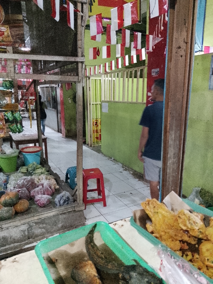 A market scene displays trays of food in the foreground, including fried items and fish. Behind the food stand is a stall with pumpkins, vegetables, and other items in bags. A man in a blue shirt and shorts is walking in the background. Red and white banners are hung above a walkway with green walls and a white tiled floor. A red stool is situated along the side of the walkway.