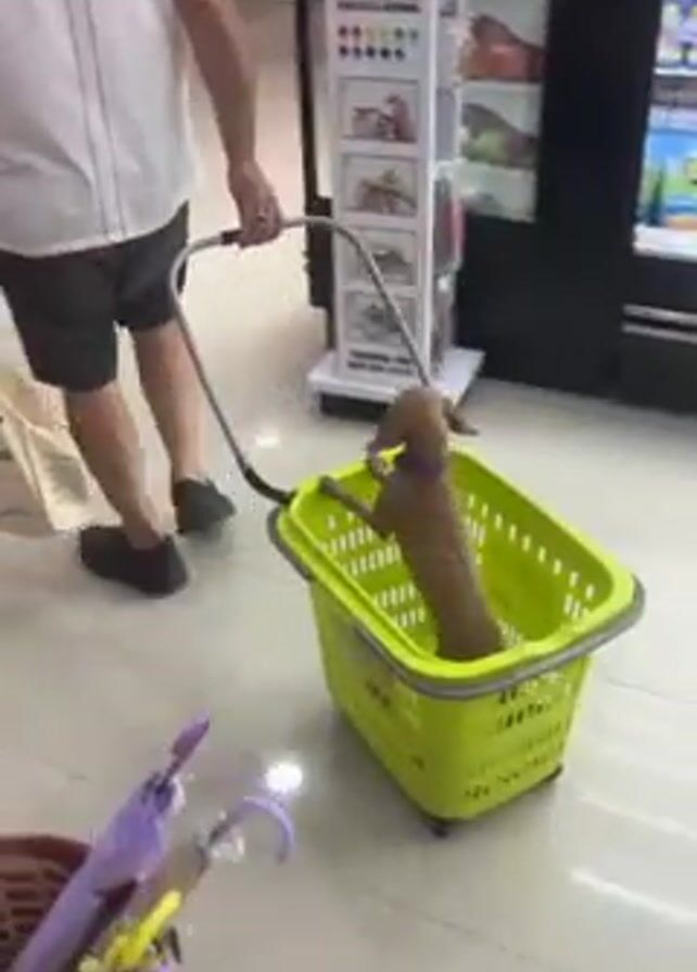 A man pulls a lime green shopping basket on wheels. Inside the basket sits a small brown dog, upright, wearing a purple collar. The man is wearing a white t-shirt with a cross on the back, dark shorts, and black shoes. He is carrying a shopping bag in his left hand. The scene appears to be inside a store with tiled floors. Shelves and refrigeration units filled with products are visible in the background. The man pulls the basket with the dog through the store.