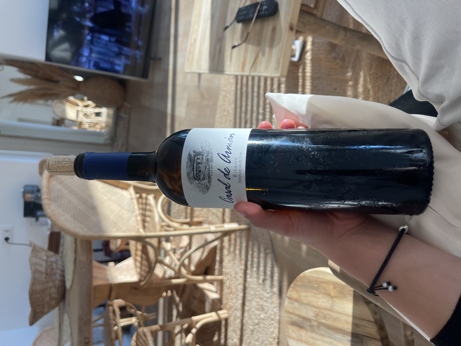 An interior scene in Vilar, Spain, features a person's right hand holding a condensation-covered bottle of dark-red wine. The bottle is labeled "Casal de Armán Ribeiro Denominación de Oríxe" and has a blue capsule around its neck, with a cork partially inserted. The person's wrist displays a black cord bracelet adorned with small silver beads, and their leg, covered in light-colored fabric, is visible below the bottle. To the immediate left, a partial view of a round, light-toned wooden side table is present. To the right, a rectangular wooden coffee table holds a pair of dark-framed eyeglasses and a black remote control. The background reveals a dining area with a large wooden table, centered with a woven basket. Four wicker-backed chairs surround the table. Harsh sunlight creates prominent, parallel shadows across the light-colored floor. Further back, a tall mirror reflects parts of the room, including a dried decorative plant in a wicker vase, resembling pampas grass. A large, dark flat-screen television is also visible, reflecting its surroundings. In the far background, a white wall with an electrical outlet and a small kitchen appliance are partially discernible.