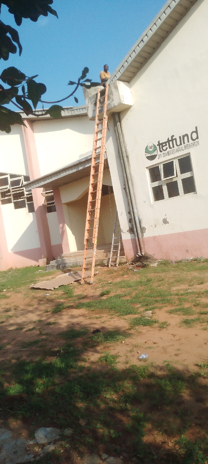 An outdoor, daytime photograph captures a cream-colored two-story building with a light pink base and a grey roof overhang, under a clear blue sky. On the building's right facade, the word "tetfund" is prominently displayed in black, stylized text, accompanied by a logo and the inscription "2017-20XX MERGED ANNUAL INTERVENTION". A single adult individual, wearing a yellow long-sleeved shirt, is perched on a concrete ledge near the roofline, facing generally right, positioned at the top of a tall, orange extension ladder propped against the building. A smaller, silver stepladder stands upright against the building to the right of the orange ladder's base. The ground foreground consists of dry, reddish-brown earth with sparse patches of green grass. Scattered litter, including a flattened cardboard box and a plastic bottle, is visible on the ground. Dark green leaves from an overhead tree or bush partially obscure the upper left quadrant of the frame. The scene is located in the city of Unknown, Unknown.