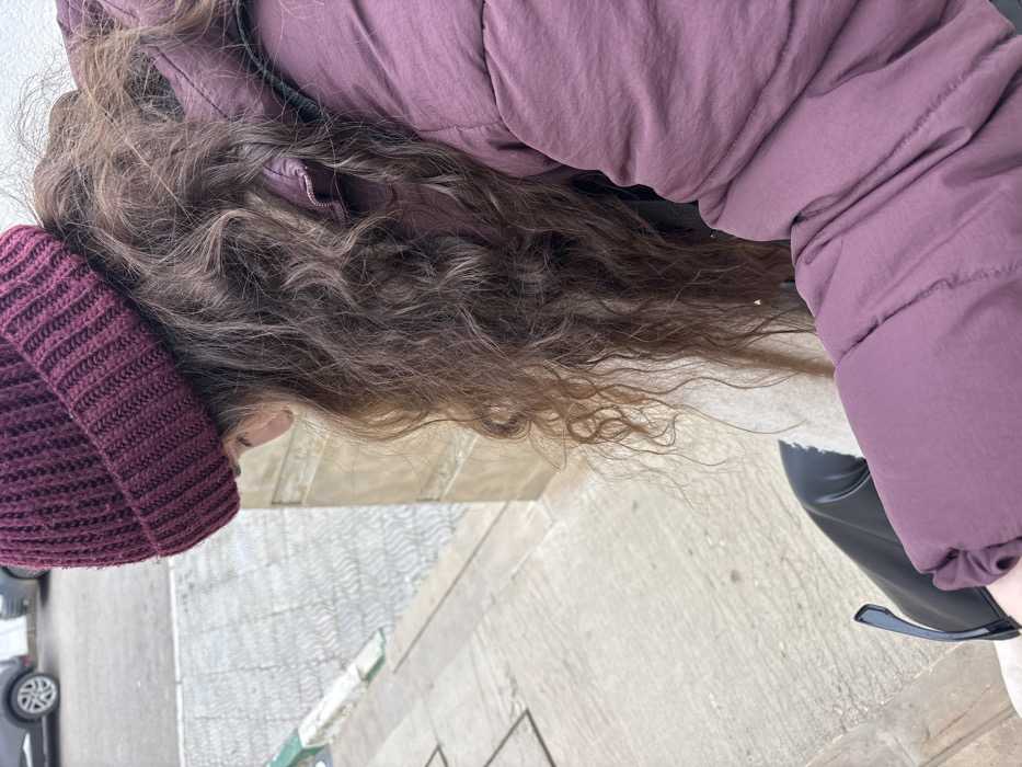 An individual is depicted outdoors in Meknes, Morocco, observed from a slightly elevated perspective focusing on their upper body. The subject has long, dark brown, curly hair and wears a dark burgundy ribbed knit beanie and a dusty rose-colored padded puffer jacket. A light-colored garment is visible beneath the jacket. Black, possibly leather, pants cover the lower body. The individual is seated on a light-colored concrete step, looking downwards. A pair of black-framed sunglasses is present on their lap or held in their left hand. The background reveals a patterned light-colored paved surface, a low curb painted green and white, and several parked vehicles on a street under ambient daylight conditions.