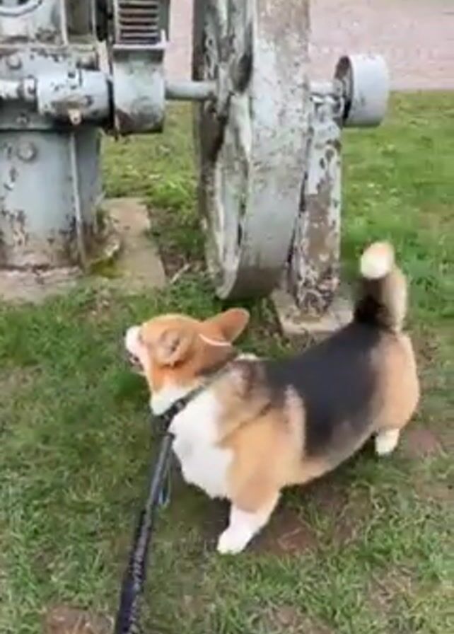 corgi dog on a leash, standing on a patch of green grass near a large, old metal contraption with wheels