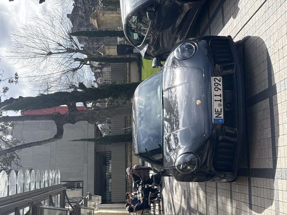 The image displays an urban scene in Bordeaux, France, featuring a street-level view of an outdoor café and parked vehicles under bright daylight. In the foreground, a black Porsche 911 (992 generation, likely a GT3 variant due to its aggressive front bumper) is prominently parked on a light-colored tiled pavement, facing the viewer. Its German license plate reads "D NE II 992". To the immediate right of the Porsche, a dark-colored Tesla (appearing to be a Model 3 or Y) is partially visible, positioned next to a black electric vehicle charging station. To the left of the Porsche, an outdoor seating area of a café or restaurant is visible. Approximately six to seven individuals are seated at two tables, engaged in conversation or dining. They are dressed in casual to semi-casual attire, with one person wearing a white baseball cap. The building facade adjacent to the café area features ornate lantern-style light fixtures beneath a glass canopy. The background presents a mix of architecture and vegetation. A large, gnarled deciduous tree with bare branches stands behind the Porsche, flanked by several tall, slender evergreen trees. Beyond these trees, a modern, grey concrete building with distinct square windows is visible. To its right, an older, ornate stone building with a decorative metal fence and robust stone pillars completes the backdrop. The sky is partially cloudy, and the scene is illuminated by strong sunlight, casting visible shadows on the tiled ground.