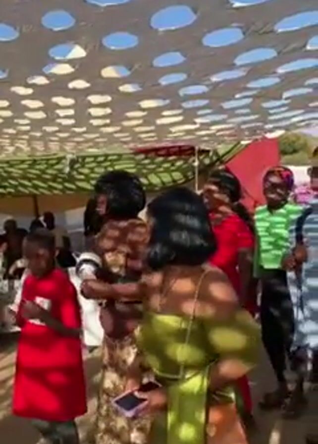 The video depicts a gathering of people, mostly women, under a white canopy with large holes, creating a dappled light effect. The setting appears to be outdoors with a clear blue sky visible through the canopy. The women are dressed in various colors and patterns, with some wearing traditional African clothing. There is one child in a red shirt. Some of the women are dancing and moving to music. One woman in a green dress is holding a smartphone, possibly recording or taking pictures. The overall atmosphere seems festive and celebratory. There are tables and chairs visible in the background, suggesting the event may be a party or gathering of some kind.
