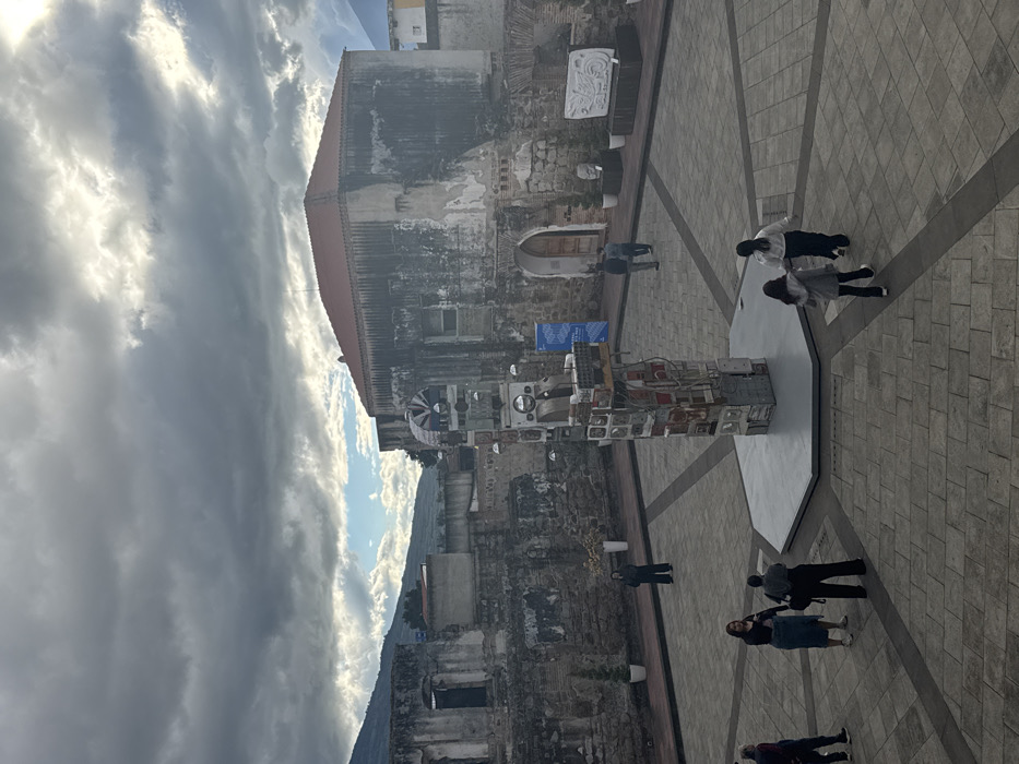 An outdoor plaza features a tall, abstract sculpture composed of small, square compartments. People stroll around the sculpture on a paved square with diagonal lines. Adjacent to the square, a weathered building stands with a red-tiled roof. A mountain looms in the background, partially obscured by the building. The sky overhead is filled with a mix of clouds, with patches of blue visible.
