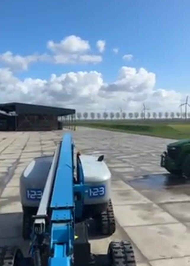 view from a blue boom lift on a large concrete pad, possibly at an industrial or agricultural site. The boom of the lift is pointed upward. Next to it, on the right, is a green John Deere tractor. A long, straight row of trees lines the background, with wind turbines visible beyond them. The sky is blue with scattered white clouds. A large, open-sided building is on the left. The sun is shining.