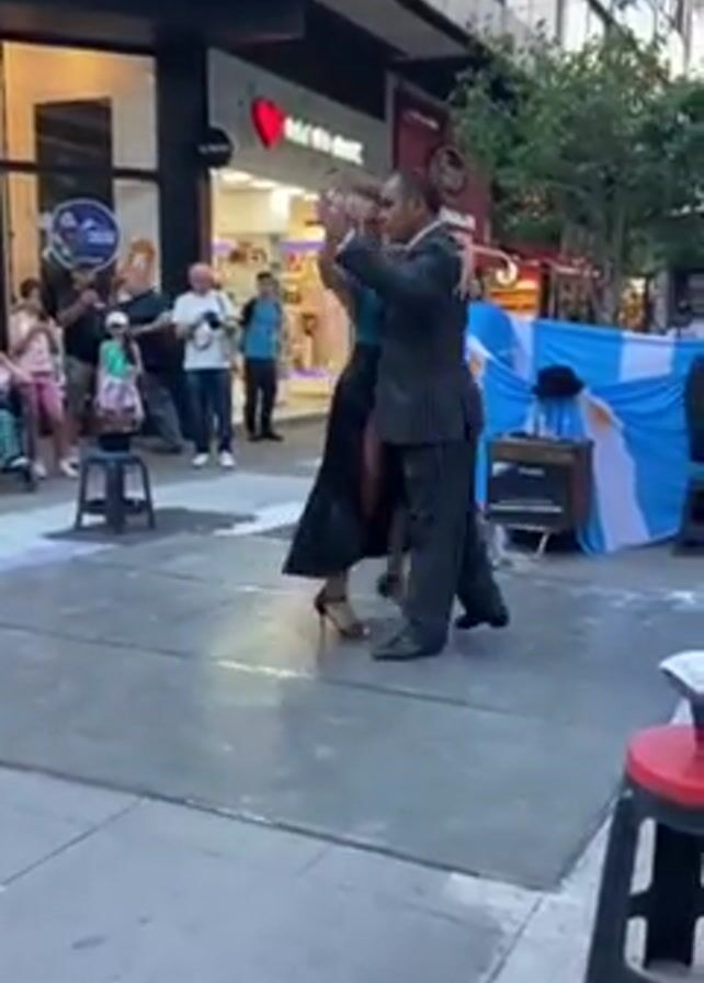 On a city street, a man and woman dance the tango. The woman wears a dark green top, a long black skirt with a high slit, and heels. The man wears a pinstriped suit. They are surrounded by onlookers. Behind them is an Argentinian flag. There is a black speaker on a small table. Shops line the street.