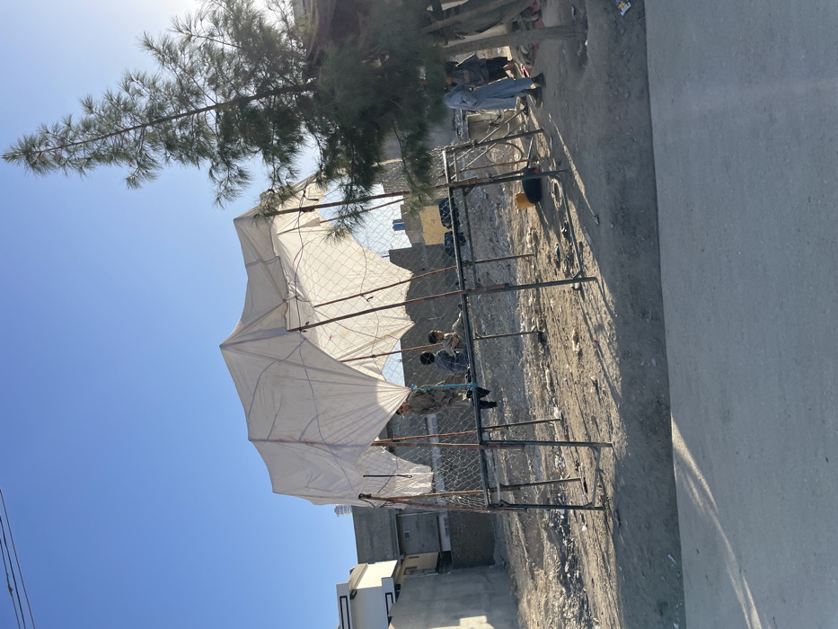 An outdoor scene in an urban area, possibly a vacant lot or undeveloped property, is depicted under a clear, bright blue sky with low sunlight. The foreground shows a grey paved road. Dominating the midground is a makeshift, open-sided structure with a framework of dark metal poles supporting an elevated rectangular platform. A white tarp or fabric sheet forms a canopy over the top, secured with wires or ropes, with netting partially enclosing the sides. Under this canopy, one adult male in tan clothing stands, facing left. Two young boys are seated on the elevated platform, looking right. On the right side of the image, partially obscured by a tall conifer tree, two individuals in light-colored traditional garments stand, with another smaller figure nearby. A fourth individual is crouched on the ground near the tree. The ground within the lot is uneven, bare earth with scattered debris. Behind the structure, various residential buildings are visible, including a modern white house on the left and older concrete structures. A tall building is faintly visible in the far background. Shadows from the structure, people, and tree are cast across the dusty ground.