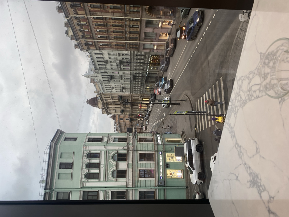 The image depicts an urban street scene in Saint Petersburg, Russia, specifically focusing on Bolshoy Prospekt Petrogradskoy Storony. The viewpoint is from an elevated position, looking northeast along the multi-lane thoroughfare under an overcast sky. In the foreground, the lower portion of a white, marble-patterned tabletop or windowsill is visible, with a clear glass or cup resting on it. Below this, a pedestrian crosswalk (zebra crossing) spans the street. Three individuals are on the crosswalk: one person in a red hat and light-colored jacket walking right, another in a yellow jacket and dark pants (possibly a delivery person) with a backpack walking left, and a third person in dark clothing partially obscured behind the yellow-clad individual. Two yellow pedestrian crossing signs are affixed to a pole near the crosswalk. To the left, a prominent five-story mint-green corner building with white architectural trim dominates the immediate left side. This building is located at Bolshoy Prospekt Petrogradskoy Storony, 29/2, at its intersection with Oranienbaumskaya Ulitsa. Its ground floor features two storefronts: "Vision Center" with illuminated displays and "ОПТИКА" (Optics). A white Cadillac Escalade SUV is parked at the curb directly in front of this building. Another pedestrian is visible on the sidewalk adjacent to the green building. The street, Bolshoy Prospekt Petrogradskoy Storony, is asphalt with white lane markings and a solid double yellow line separating directions of travel. Numerous vehicles, including sedans and SUVs of various colors, are present on the road; some are moving, and others appear parked along the right curb. A blue sedan is prominent on the right side of the road, moving towards the viewer. Across the street from the green building, a continuous row of multi-story historical buildings lines the right side of the street, extending into the distance. These buildings exhibit diverse architectural styles and colors, ranging from light grey to brown and brick red, some featuring ornate facades and decorative elements. A distinctive dome-topped structure is visible further down the street on the left side (belonging to the House of Benedicts at Bolshoy Prospekt PS, 30). Overhead utility lines are visible against the cloudy sky.