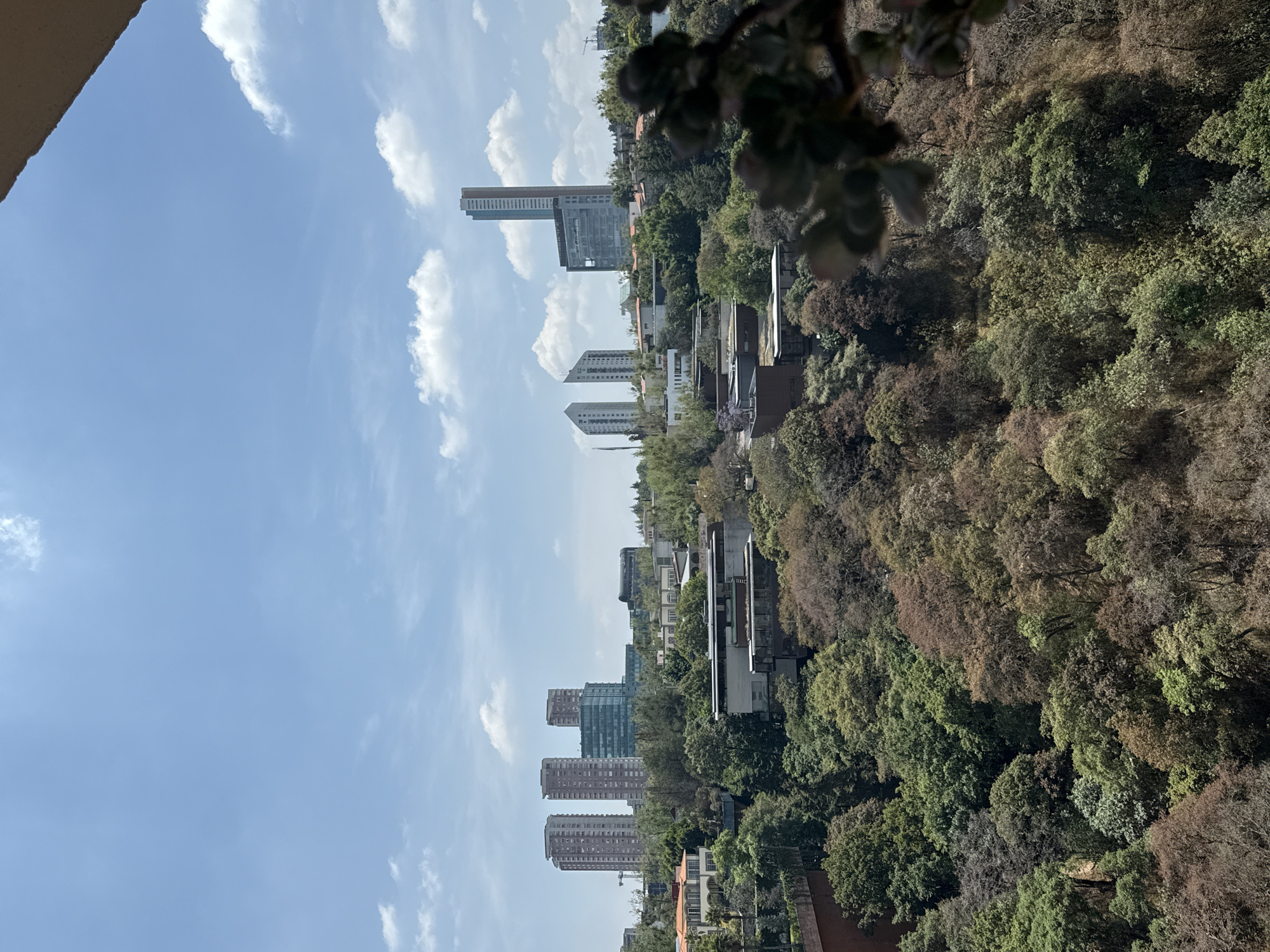 The image depicts a landscape in Mexico City, Mexico, from an elevated perspective. The sky is blue with scattered white clouds. A mix of urban and natural elements is present, including buildings, skyscrapers, and a dense forest of green and brownish trees. The architecture varies, featuring high-rise structures alongside residential buildings. The image also includes vegetation hanging in the top right corner.