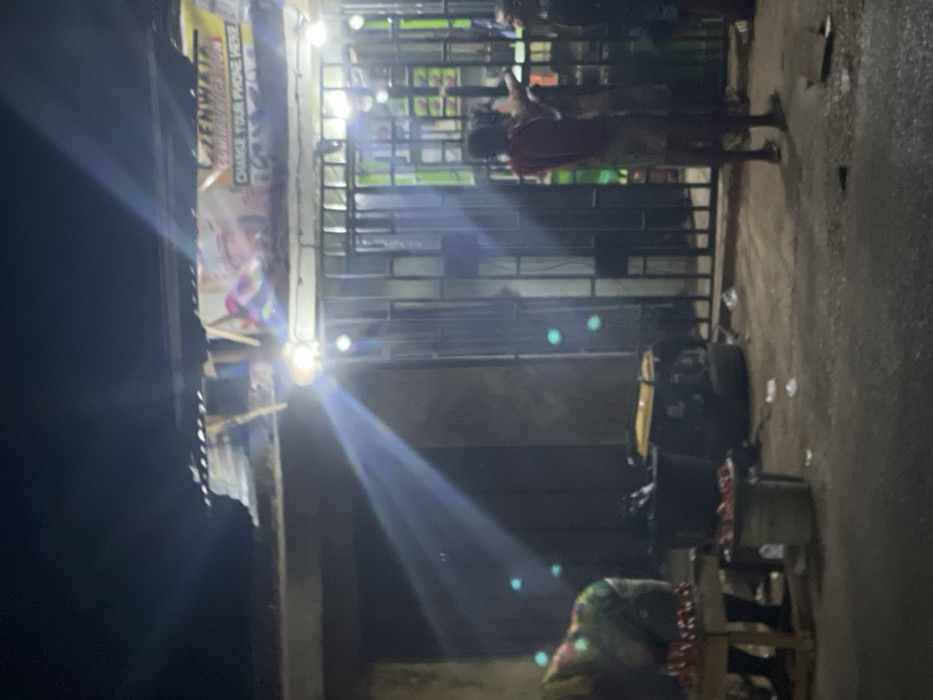 A night scene shows a small shop with metal bars across the front. People stand near the entrance. Above, a sign reads "ZENWAJA Communication CHARGE YOUR PHONE HERE." A bright light obscures some details. The street appears wet, and there is debris scattered about. A makeshift table with various items sits in front of the shop. The scene is overall dimly lit.