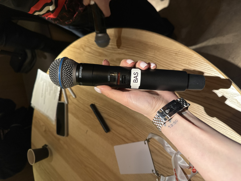A woman's hand holds a black Shure microphone with a "BAS" label