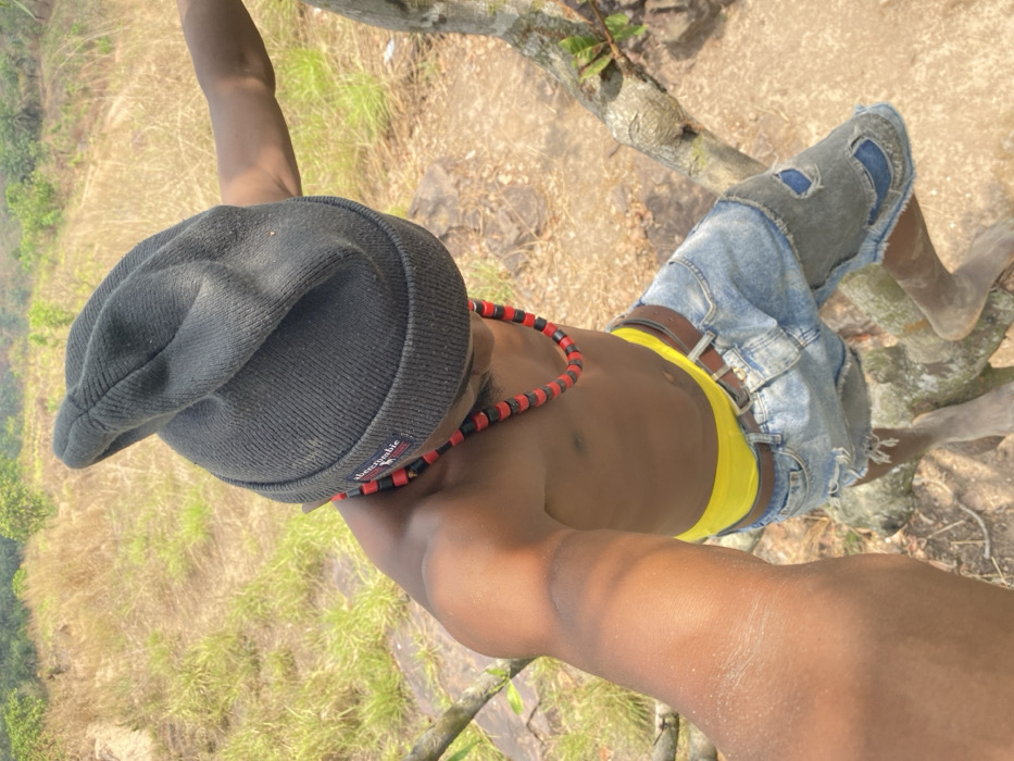 A man in a black beanie, red and black beaded necklace, and yellow underwear sits on a tree branch. He wears distressed jean shorts and a brown belt. His feet rest on another branch. The background shows dry grass, vegetation, and exposed soil. The photo is taken from an upward angle, suggesting the camera is below the man in the tree.