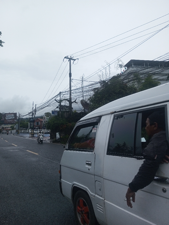 The image depicts an urban street scene in the city of Babaliya Mal., India, under an overcast sky with a damp asphalt road. A white van, featuring red-orange wheel rims, occupies the right foreground. A man, wearing a dark cap and jacket, leans out of the front passenger window, his right arm resting on the window frame and holding a cigarette between his fingers. The two-lane road ahead shows yellow and white markings. In the mid-ground, a white scooter with a rider is visible, alongside other distant vehicles. Utility poles with a dense network of overhead wires line the left side of the road, behind which a large satellite dish and multiple buildings are present. A billboard in the left background displays the text 'TEMBANG KENANGAN'. Green trees and foliage are interspersed, and misty hills are faintly visible in the far distance.