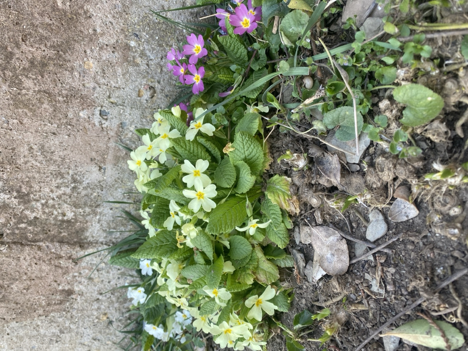 The scene, located in Vlado Trichkov, Bulgaria, presents a ground-level view of flora against a weathered structure. Multiple primrose plants are documented, featuring pale yellow blossoms with yellow centers predominantly positioned left of center, alongside a smaller grouping of magenta blossoms with yellow centers to the right. White primroses are partially visible on the far left. The plants display prominent green, textured leaves. The immediate foreground comprises dark soil, interspersed with dry leaves, small stones, and emergent green vegetation, including sparse grass blades. A small, white, ovoid object is identifiable on the soil in the mid-right. The background consists of a rough, light-colored concrete or stone wall, displaying textural variations and environmental patina. Illumination suggests ambient daylight conditions.