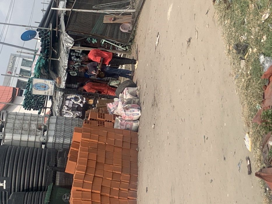 The image depicts an outdoor scene in Jakande, Nigeria, characterized by a concentration of building materials and an informal commercial establishment