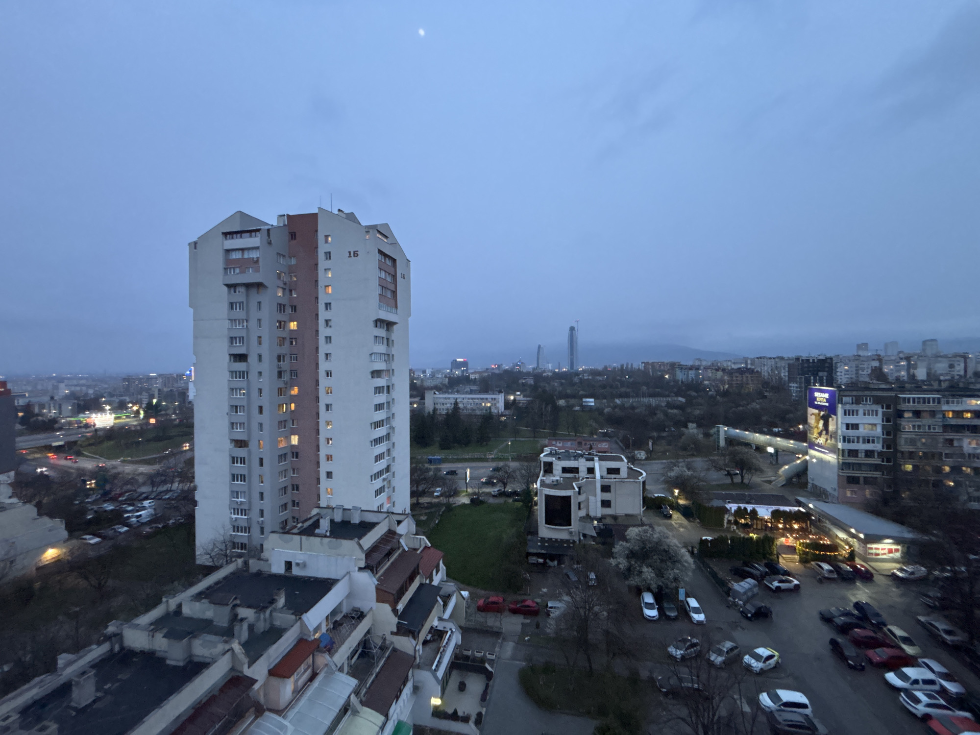 This image captures a twilight cityscape, likely in Sofia, Bulgaria, given the architectural style and urban layout. The scene is dominated by a tall, multi-story residential building with a partial view of a "16" number. Other buildings of varying heights and styles surround the primary structure, showcasing a mix of residential and commercial properties. A pedestrian bridge with a billboard ad is visible in the right of the frame. The streets are filled with parked cars. Streetlights and lit windows suggest it is either late evening or early morning. The sky is overcast and pale, hinting at either dawn or dusk. The overall setting indicates an urban residential area in Sofia.