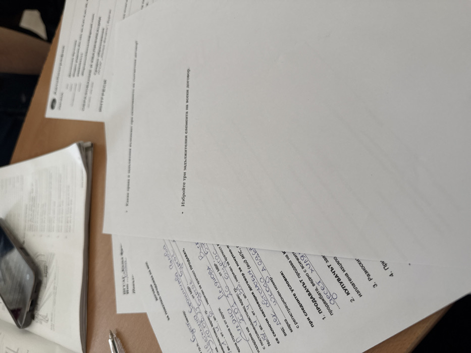 An overhead view captures a static arrangement on a light-brown wooden surface, likely a desk. The scene is dominated by several white paper documents. In the upper left quadrant, a dark-colored smartphone, possibly black, lies screen-down on a stack of papers. To its immediate left, a clear plastic ballpoint pen is positioned. The most prominent document is a "ДОГОВОР ЗА ПОКУПКО-ПРОДАЖБА НА МПС" (Contract for Purchase and Sale of a Vehicle), featuring handwritten blue ink entries. Visible details include "гр. Бургас" (city of Burgas), names such as "Веселина Вранчинира Павлова" and "Лиляна Велкова Въл", a date "10.08.23", and an address "Перущица 26". The contract explicitly refers to a "лек автомобил" (passenger car). To the right, another document displays a printed question in Bulgarian: "Избройте три задължителни елемента на всеки договор." (List three mandatory elements of every contract.). A partially visible document in the upper right quadrant is titled "АВТОБИОГРАФИЯ" (Autobiography) and shows sections such as "ОБРАЗОВАНИЕ И КВАЛИФИКАЦИИ" (Education and Qualifications) and "ИНТЕРЕСИ" (Interests). The presence of these documents, particularly the contract specifying "гр. Бургас," confirms the city of Burgas, Bulgaria, as the identified location context for the contents of the papers. The scene suggests an administrative, legal, or educational environment where documents are being prepared, reviewed, or studied. No individuals are present in the image.
