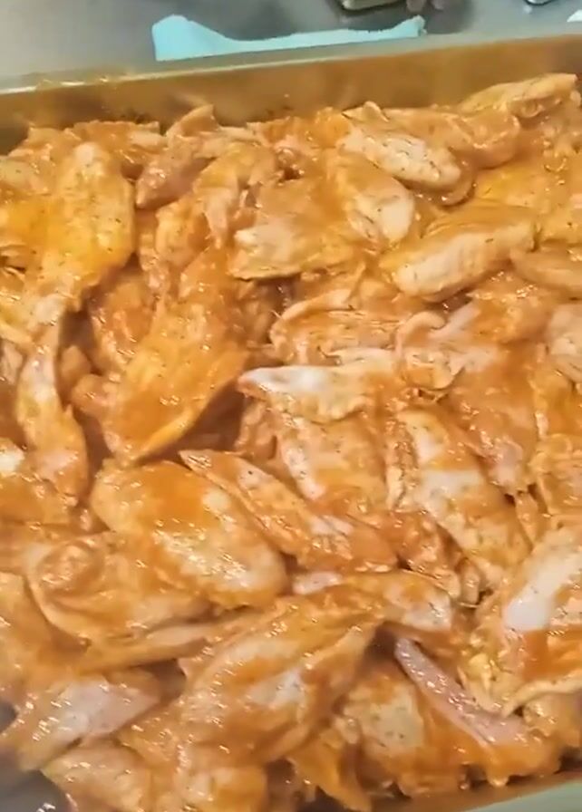 two full aluminum trays, stacked on top of each other. Both trays are filled with raw chicken wings, heavily coated in a reddish-orange marinade. A person is visible in the background, with dark skin, writing in a notebook with a green pen. A mobile phone is lying next to the notebook on the table. Sounds of voices and other indistinct noises can be heard in the background.