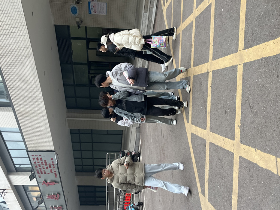 The image captures an outdoor scene in front of the Jiangjin District Dingshan Agricultural Market in Jiangjin, China. The market building is a multi-story, light-colored structure featuring large, dark-tinted windows. A prominent red horizontal sign above the ground floor entrance displays the market's name in Chinese characters ("江津区鼎山农贸市场"). Below this, a smaller red sign indicates operating hours, specifically "7:30 - 10:30." Eight individuals, appearing to be young adults, are present on an asphalt surface marked with distinctive yellow grid lines. On the far left, a male in a tan puffer jacket, light blue baggy pants, and glasses walks towards the right, actively observing a smartphone held in his left hand, while a folded paper is in his right. Nearby, a light blue electric scooter and a dark motorcycle are parked. In the central area, a group of five males moves towards the right. One male in a light grey denim jacket over a dark shirt and black pants raises his right hand towards his face. Another male to his left, wearing a white sleeveless vest over a dark top, has his left arm draped over the shoulder of the male in the denim jacket. A third male to the right, in a grey puffer jacket and light blue jeans, holds a white rectangular carton in his left hand. Two additional males are partially visible within this cluster, dressed in dark attire. On the right side of the frame, a female wearing a white puffer jacket, a white baseball cap, and black flared pants walks towards the left. She carries a multi-colored tote bag in her left hand and observes a smartphone held in her right hand. Behind her, a male in dark clothing is partially visible. Two white security cameras and a white rectangular no-smoking sign are mounted on the building facade to the right of the main entrance.
