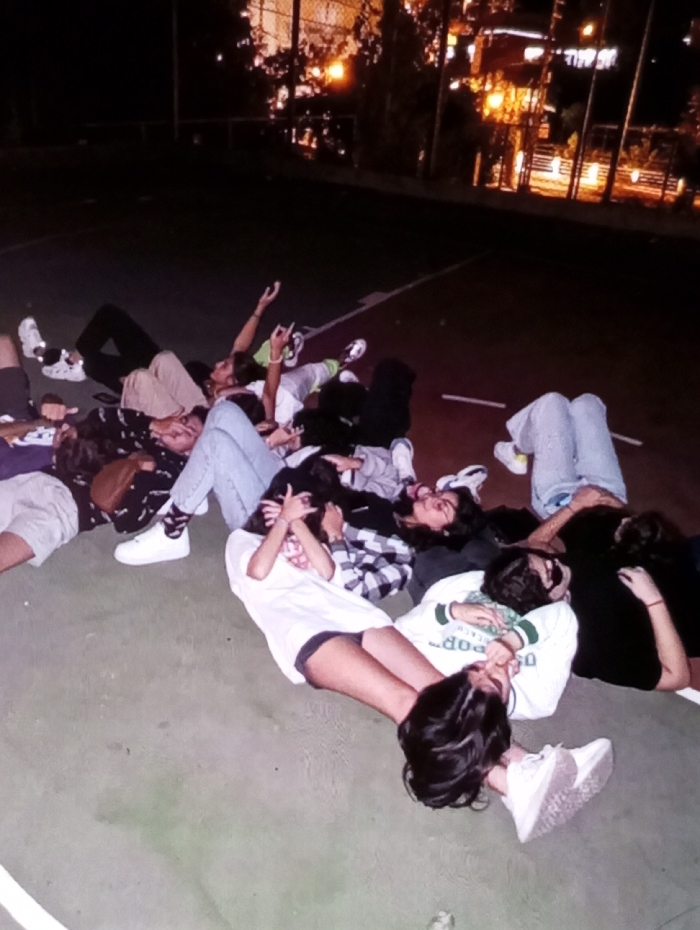 - "The image depicts a nighttime scene in Hojalar, Uzbekistan, featuring nine individuals lying on their backs on an outdoor court surface" by FM-1o2DD3, licensed under CC BY 4.0