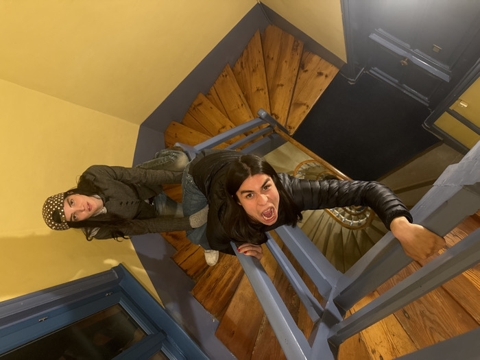 This image, rotated 90 degrees clockwise, depicts two individuals inside a building in Roanne, France, positioned on a multi-level spiral staircase. The staircase features wooden treads and blue-painted railings. The subject on the left, with long dark hair, wears a black puffer jacket and blue jeans. They are shown gripping a blue handrail with their left hand, their mouth open wide and eyes wide, facing the camera. Below them, a dark doorway is visible on a landing, alongside the central dark void of the stairwell. The subject on the right, also with long dark hair, wears a dark grey jacket and blue jeans, with a dark head covering adorned with white polka dots. They hold a blue handrail with their left hand, with their right foot, wearing a white shoe, visible on a wooden step. This individual maintains a neutral expression, looking towards the camera. The background includes yellow-painted walls and a blue-framed window positioned in the upper right portion of the image.