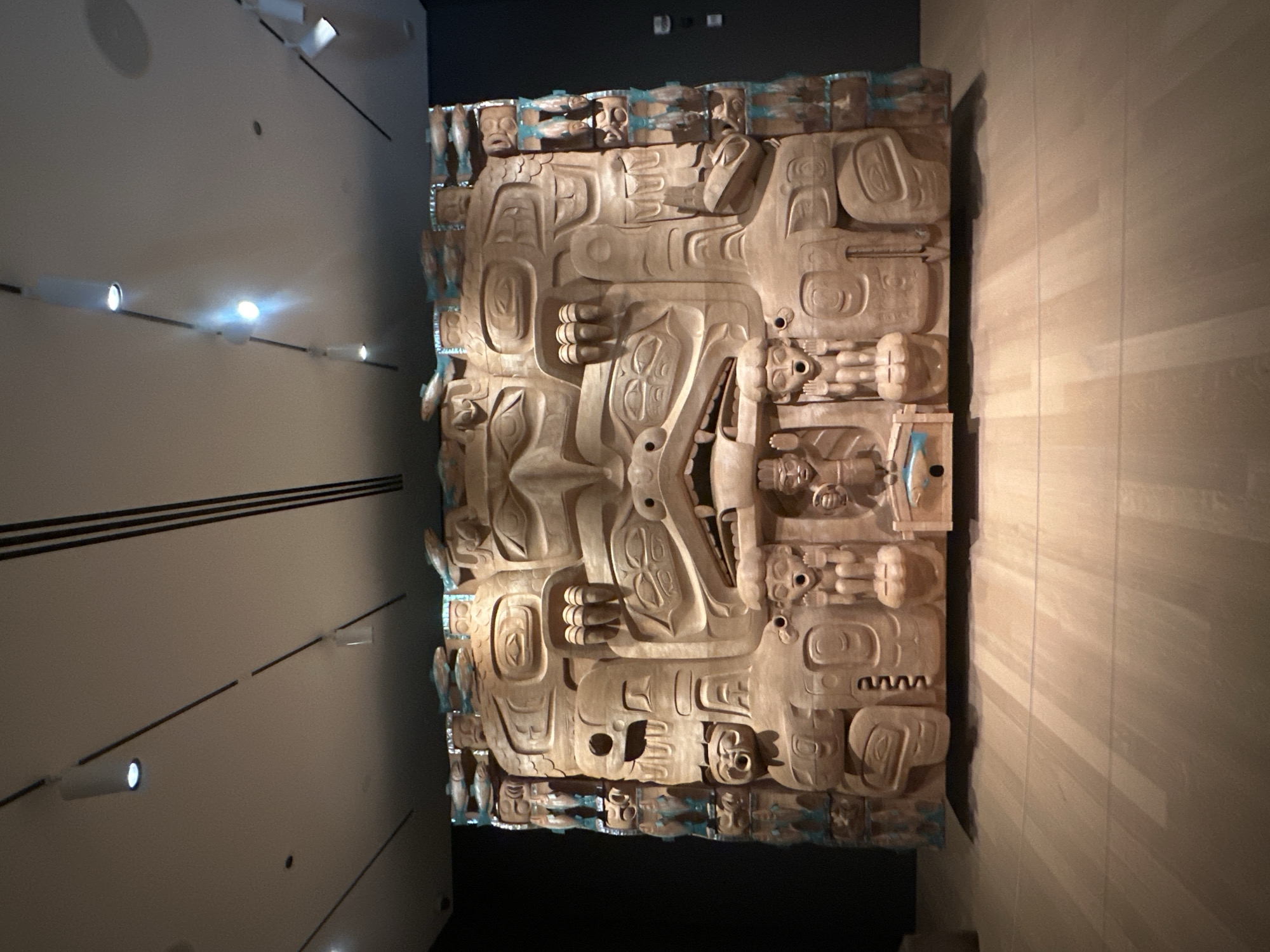 The image captures a large, intricately carved wooden art piece in a vertical orientation