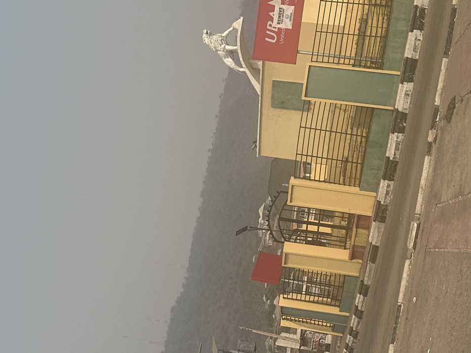The image displays a static, wide-angle view of a roadside scene in Lokoja, Nigeria, characterized by a hazy, light grey sky