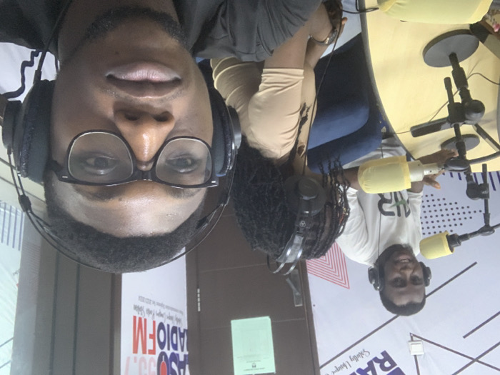 This image depicts an indoor radio broadcast or recording studio located in Ijanikin, Nigeria