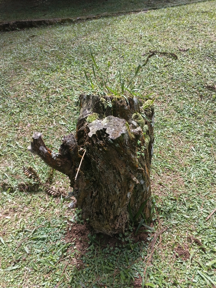A partially decayed tree stump is present in a grassy outdoor area, located in Tapaiteng Uesa, Bhutan