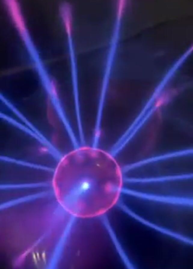 plasma ball with blue and purple electrical discharges emanating from a central sphere