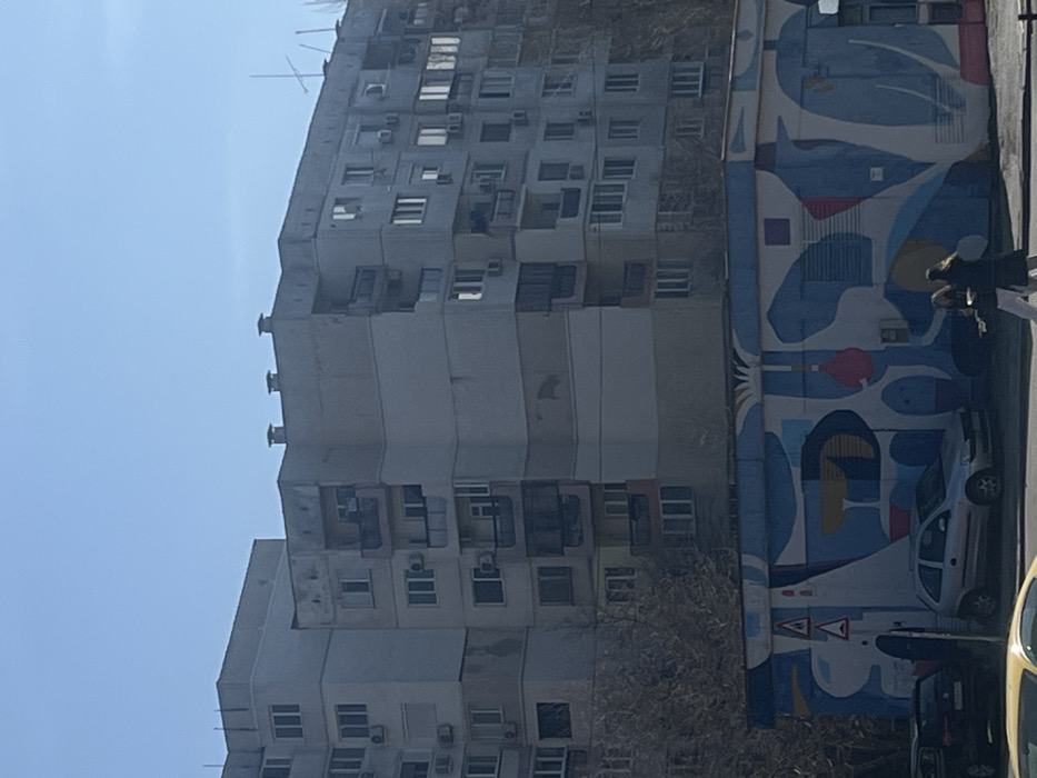 The scene depicts an urban environment in Sofia, Bulgaria, under a clear blue sky. In the background, multiple multi-story concrete residential buildings, characteristic of post-socialist architecture, exhibit grey facades, numerous windows (some with external shutters), and an abundance of externally mounted air conditioning units. Several balconies, some open with metal railings and others enclosed, are visible. The building surfaces show signs of wear and discoloration. Flat rooftops feature ventilation shafts, chimneys, and an antenna array on the rightmost structure. Bare deciduous trees are situated between these taller buildings and a lower structure in the mid-ground. The mid-ground is dominated by a single-story utility building or kiosk, identifiable by its vibrant, abstract mural. The mural features organic and geometric shapes predominantly in shades of blue, white, and red. The building has a closed metal roll-down shutter and service panels on its facade. In the foreground, a paved street runs horizontally, bordered by a curb and a sidewalk. A silver three-door hatchback vehicle is parked on the street directly in front of the mural. Partially visible to its left is a dark-colored SUV, and the roof of a yellow vehicle is visible in the bottom-left corner. A vertical pole supporting two stacked triangular road signs (danger warning signs) stands on the pavement to the left of the mural-decorated building. Two individuals, appearing to be adult females, are walking from left to right on the sidewalk in front of the mural. One wears a dark jacket and light-colored trousers, while the other is dressed in a dark jacket. Both are in mid-stride. The specific location in Sofia is identifiable by the distinct mural on the utility building, which is situated on **Boulevard Vitosha, near the intersection with Ulitsa "Byala Cherkva"**, heading towards South Park.