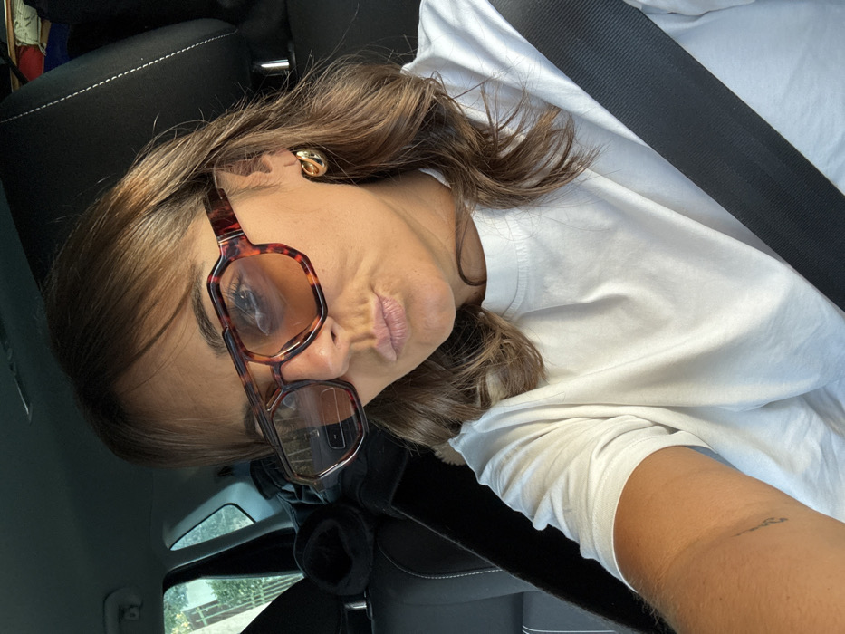 A female individual is depicted in a medium shot, seated inside a vehicle in Le Cannet, France. She has shoulder-length brown hair with bangs and tanned skin. She wears large, hexagonal sunglasses with tortoise-shell frames, amber-tinted lenses, and a distinct clear lower panel below the left lens. A plain white crew-neck t-shirt covers her torso, and a black seatbelt is fastened across her right shoulder and chest. A small, minimalist tattoo is visible on her left upper arm, and a gold hoop earring adorns her right ear. Her lips are pursed in a 'duck face' expression, directed towards the camera. The vehicle's interior features black seating. Through the rear side window, a blurry exterior daytime scene shows green foliage and ambient light.