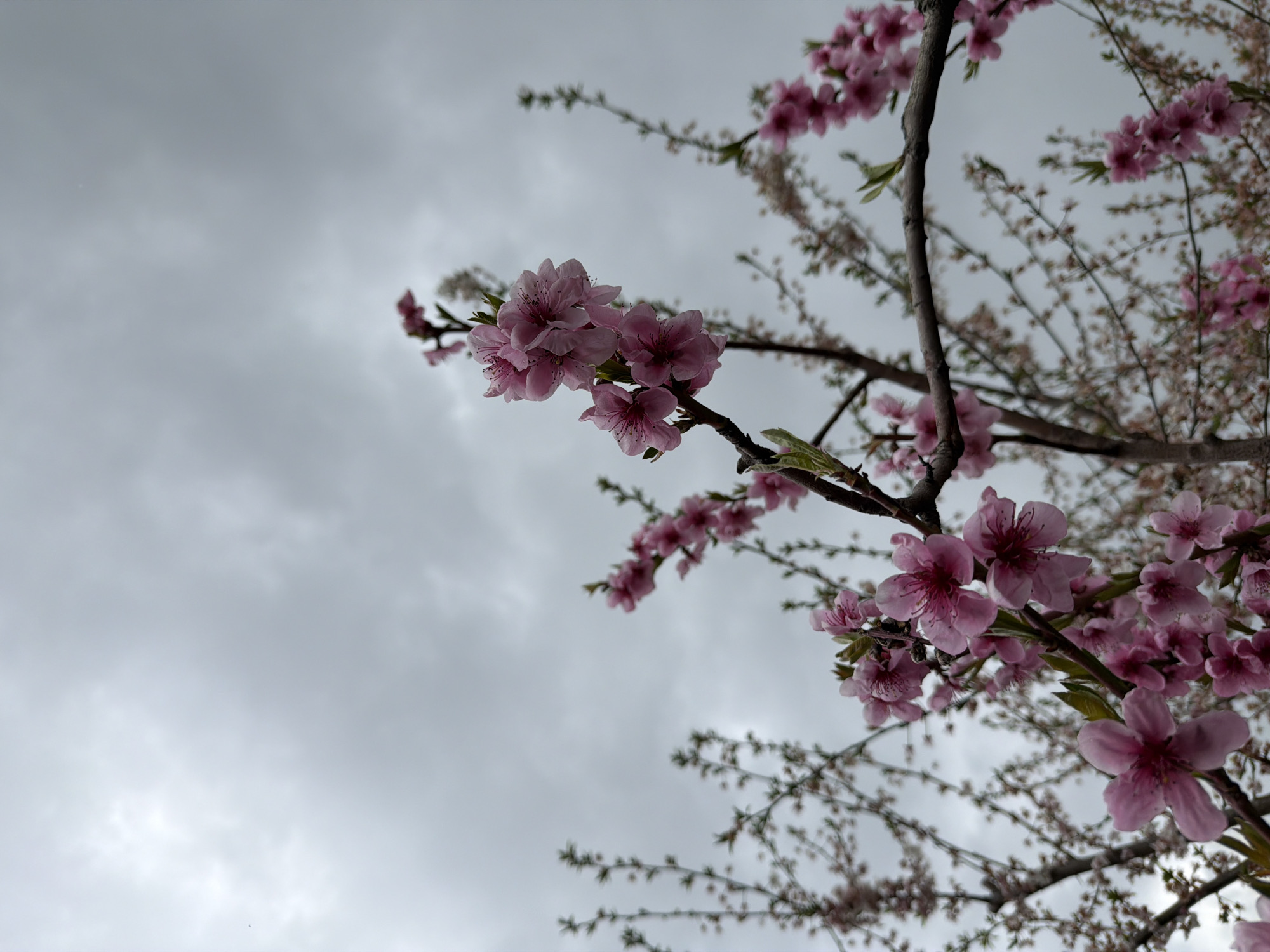 The image captures a low-angle view of a flowering tree, its branches adorned with pink blossoms