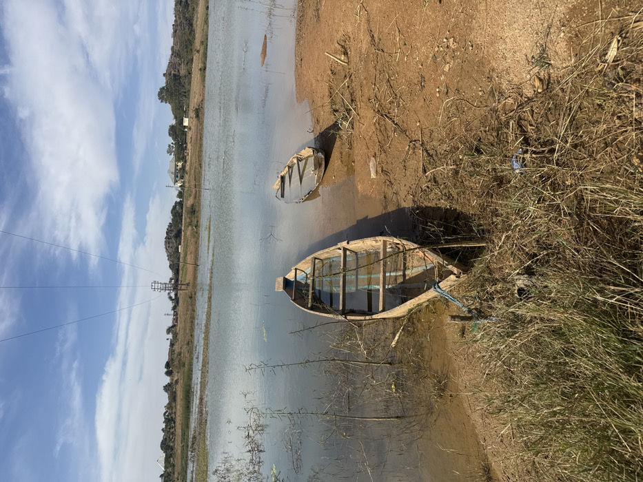 The image depicts a tranquil outdoor scene in Jos, Nigeria, focusing on a body of water resembling a lake or reservoir. In the foreground, two wooden dugout canoes are partially submerged along a reddish-brown dirt bank. The larger canoe, positioned to the left, is partially filled with water and secured to a short wooden post with a blue rope. Sparse, dry grassy vegetation grows along the immediate shoreline. To the right, a smaller, older wooden boat is also partially submerged and filled with water, resting closer to the water's edge. The water surface exhibits gentle ripples and reflects the clear blue sky, with some submerged vegetation visible, including thin stalks and what appear to be lily pads. Across the expanse of water, the distant shoreline is characterized by dry, light-colored vegetation and scattered trees. In the background, several man-made structures are visible, including a prominent light-colored building with a dark roof (likely a house) situated on a slight rise to the right of the frame. Multiple utility poles and power lines stretch horizontally across the mid-ground, with a significant power line structure visible to the left. Rocky outcrops and hills, typical of the Jos Plateau landscape, are discernible on the distant horizon. The sky is largely clear blue with scattered white cumulus clouds. No people or active interactions are visible in the scene. The overall lighting suggests bright daylight.