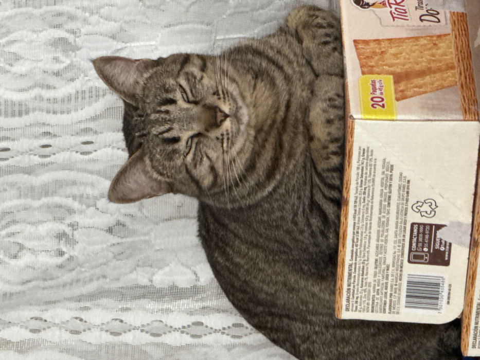 - "A brown tabby cat rests against a box of "Tia Rosa Tiras Do"" by FM-BAhUf2, licensed under CC BY 4.0