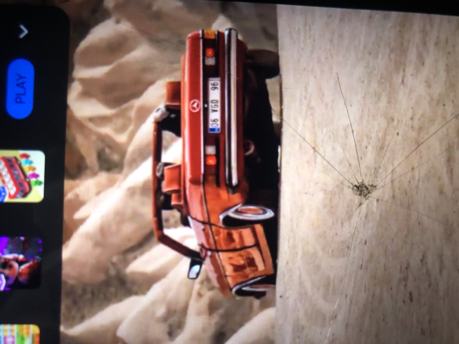 The image is a photograph of a cracked digital screen displaying a digital scene and user interface elements. A prominent starburst fracture, with multiple radiating hairline cracks, originates from the lower-center of the screen. At the top, a dark user interface bar contains three application icons: one showing a cartoon character, another a red bus with colorful passengers, and a blue "PLAY" button. The primary scene depicted on the screen features a red Mercedes-Benz classic convertible, viewed from the rear-right quarter, on a dirt road. The car has a bright red exterior, tan interior seating, and chrome trim. A Mercedes-Benz star logo is visible on the trunk. The rear license plate is white with a blue strip on the left, displaying the alphanumeric sequence "06 VGO 96". The vehicle is equipped with tires featuring white sidewalls. An indistinct dark figure occupies the driver's seat. The background consists of numerous towering, light beige-to-off-white geological formations with rounded, eroded shapes, consistent with a dry, desert-like or badlands environment. The ground beneath the vehicle is light brown dirt or sand. The vehicle's license plate "06 VGO 96" and the distinctive geological formations are characteristic of regions like Ankara and Cappadocia, Turkey, respectively. There are no visual elements within the displayed image that identify the location as Nkwelle Ezunaka, Nigeria.