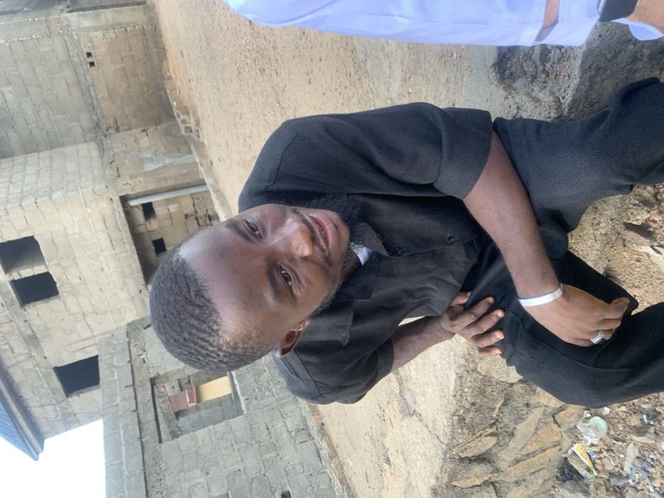 A Black male is seated on a concrete ledge in an outdoor setting within Okene, Nigeria