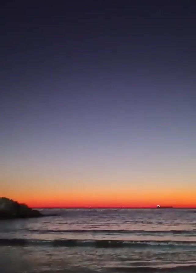 The video captures a seascape at dusk. The sky transitions from a deep blue at the top to orange and red near the horizon. The sea reflects the colors of the sunset, with gentle waves lapping the shore. Rocky landmasses are visible on either side of the frame, silhouetted against the horizon. A distant ship is visible on the water.