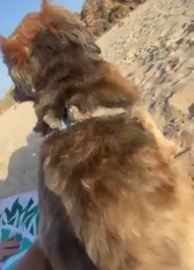 A tan and brown fluffy dog stands on a sandy beach, wearing a harness. The beach slopes upward to a rocky hill in the background. Two people are visible in the distance, one wearing blue shorts. Part of a patterned towel is visible in the foreground. The sky is blue.