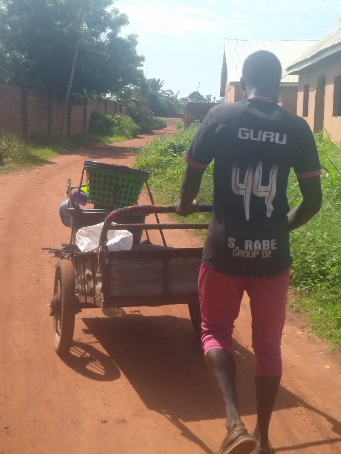 A young man wearing a black t-shirt with "GURU 44 S. RAIBE GROUP 02" printed on it, and pink pants is walking on a dirt road in Tuoniako, Nigeria, pulling a handcart. The cart is loaded with two baskets, one green and one black, and a white bag. The road is flanked by dense green vegetation on both sides. There is a building on the right side of the image. The sky is a clear blue with some white clouds. The man is walking away from the camera. The coordinates (latitude: 7.47, longitude: 7.161) indicate the location is in the city of Tuoniako, Nigeria.