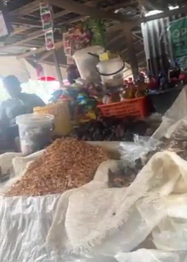 The camera moves through a market stall. The stall is covered by a corrugated metal roof. The stall is filled with various goods for sale, including dried fish, dried shrimp, bagged goods, bottles, and other items. A person walks past the camera, obscuring the view. Other people can be seen in the background of the stall.